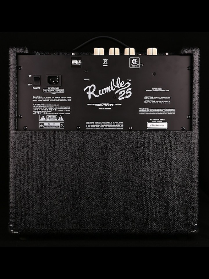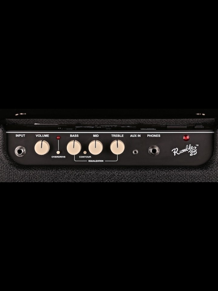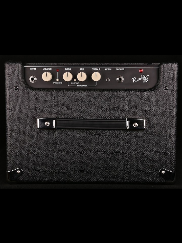 “For bassists everywhere at all levels, Rumble bass combos are re-engineered to be astoundingly compact, portable and lightweight, with seismic Fender bass tone and stage-worthy features. The stylish Rumble 25 combo pumps 25 watts of pure Fender bass tone. Small but loud, it's built with great features including classic Fender styling, 8" speaker, overdrive circuit, mid-scoop contour switch and more. A great practice, at-home and coffeehouse-gig combo for any bassist.”-from the Fender website
