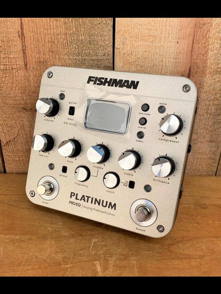 The Platinum Pro EQ is built to be stomped on with durable foot switches that activate the adjustable volume boost or high-contrast chromatic tuner. It also includes a simple and effective analog soft-knee compressor, effects loop and precision sweepable notch filter.” - From the Fishman Website