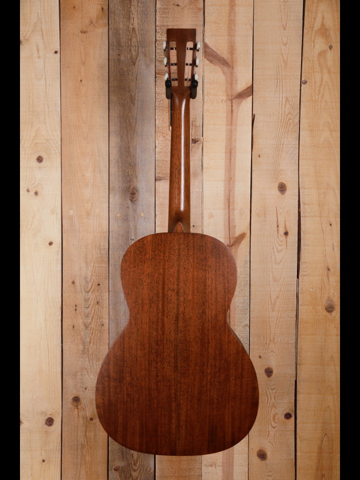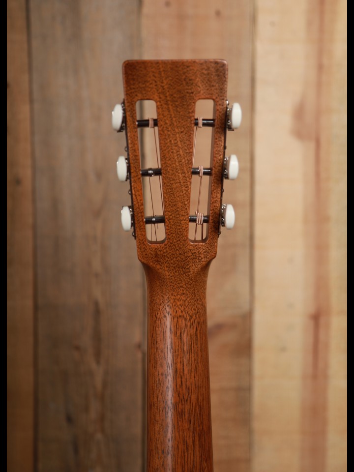 The makeover was both functional and cosmetic. Now, the top, back and side are made with genuine mahogany rather than Sapele which is sometimes called African mahogany, and the neck is also made with genuine mahogany rather than a 'select hardwood'. Bone, not Corian, is used for both the nut and the custom compensated saddle, and the bridge pins are ebony rather than plastic. The fingerboard is now tastefully ornamented with diamond and square inlays instead of dots, and the top is dressed with a high quality Delmar tortoise colored pickguard. And finally, with a look from the past, the nickel tuning machines are vintage style with open gears and butterbean knobs.