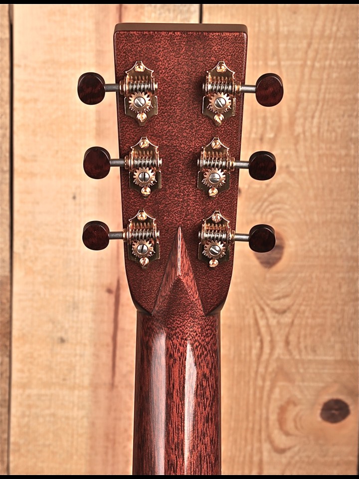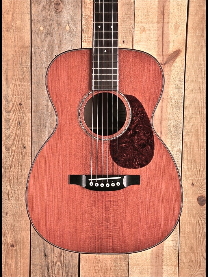 Dana Bourgeois created this stellar instrument for the 2017 NAMM show and, as many guitar builders do, he pulled out all the stops to make this a true attention getter. It is a traditional 0 body with beautiful woods and appointments. The combination of Redwood Cedar and Walnut offer a smooth mid-range balance and an articulate string separation. The depth of tone belies the small body and offers the player a very satisfying playing experience.
