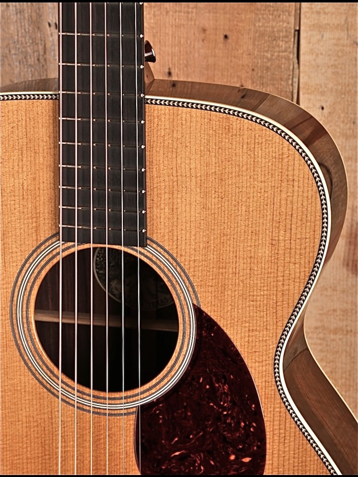 Indeed, as Collings suggests above, the Orchestra Model, or “OM,” is one of the most popular and versatile steel string guitars in existence. Valued for its innate expressiveness, power, and overall breadth of tone, the OM can certainly be right at home in a wide variety of applications. The Collings interpretation of the classic OM design is, of course, highly refined, both in terms of voicing and construction. Of course, one would be challenged to find fault with any element of a Collings build. Though perhaps skewing to the heavier side, the sturdy construction of a Collings immediately conveys long-term durability and reliability. Yet, it is clear by the tasteful and elegant end result that great care and consideration has been dedicated to the execution of every detail of the build. In concert with their precise construction, the Collings approach to voicing is characterized by excellent balance, clearly defined and separated notes, outstanding sustain, impressive dynamic range, and effortless response. Meanwhile, behind this highly articulate voicing is a dense and earthy note foundation that imparts a firm, resolute, and, dare we say, “traditional” foundation to the tone. On a whole, it is this marriage of traditional note foundation with modern standards of clarity and responsiveness that defines the “Collings voice.”
