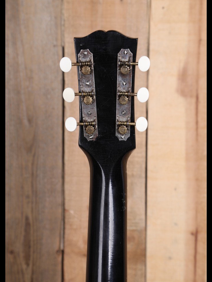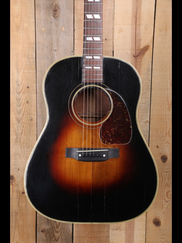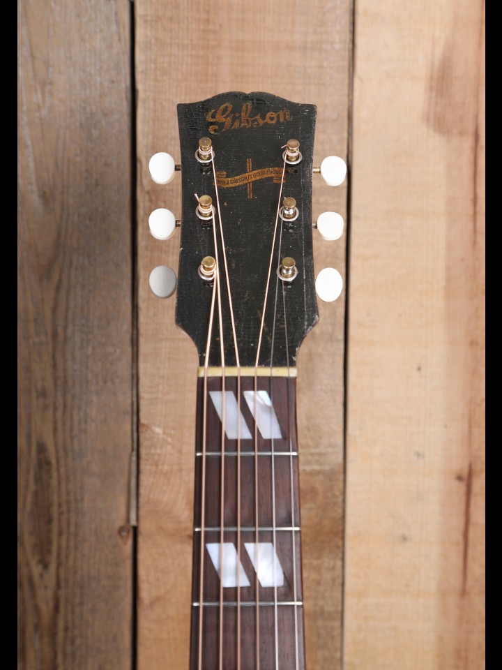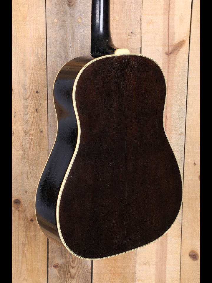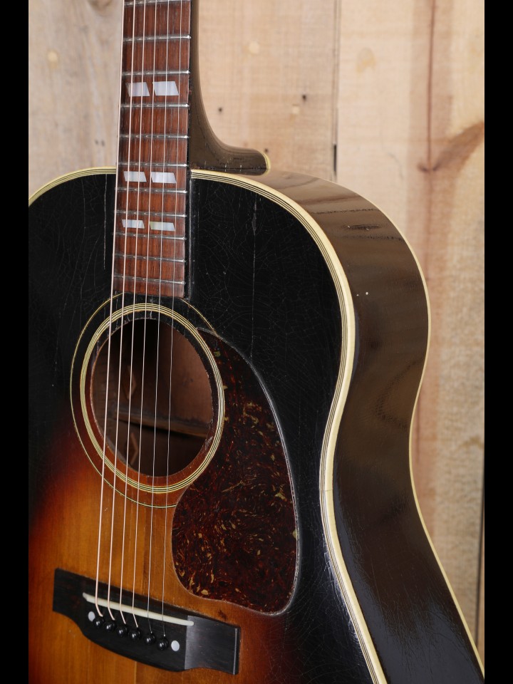 Due to the timing of their arrival on the scene, the earliest known Southern Jumbo models were very much a reflection of wartime shortages in terms of appointments. Indeed, as demonstrated by countless extant outliers made during WWII (e.g., the occasional mahogany-topped J-45, random use of maple sides or backs, etc.), Gibson has a well-established reputation for having improvised with whatever parts/material happened to be on hand during this time of material shortage. This is exemplified in one of the earliest documented examples of the SJ, number 8074H-17, which has a 3-piece maple neck, rosewood back and sides, and a pre-war (thus pre-Banner-era) silk screened logo. Quite obviously, SJ number 8074H-17, which was recently sold by RetroFret, in Brooklyn, NY, represents a major departure from what we now think of conventional Southern Jumbo spec. Of course, as many Gibson experts would attest, this production practice of ad hoc improvisation did not end with the war!