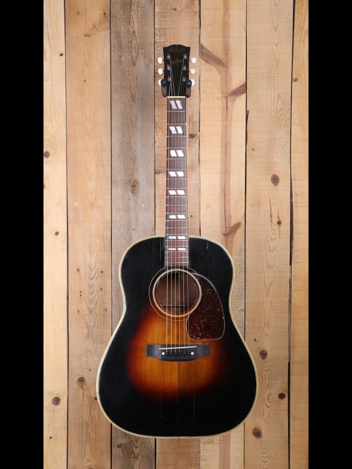 Introduced in late 1942, the Gibson Southern Jumbo was in effect a continuation of the J-55 (1939-1942). By the reckoning of some Gibson historians, the Southern Jumbo was originally designed for Gibson’s southern (i.e., south of the Mason-Dixon line) sales rep. Given that the SJ, like the J-55, is essentially a gussied-up J-45, this seems entirely reasonable, as sales reps and dealers everywhere are always keen to have something distinctive to offer to get an edge on the competition—to quote Mr. Lund, the blind radio DJ in the Cohen Brothers masterpiece, Oh Brother, Where Art Thou?, “Oh mercy, yes! We got to beat that competition!” And, with its multi-ply top border, parallelogram fingerboard inlays, and bottom belly bridge, the SJ evidently made its mark, as it has remained in the Gibson line ever since, despite its similarities to the more humbly-appointed J-45.
