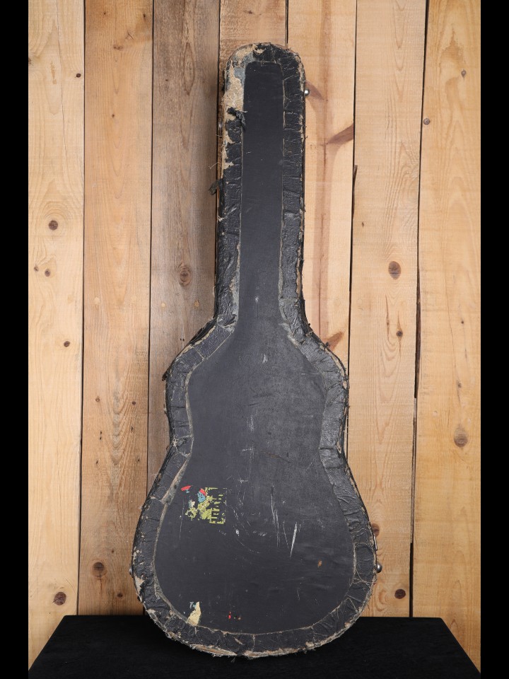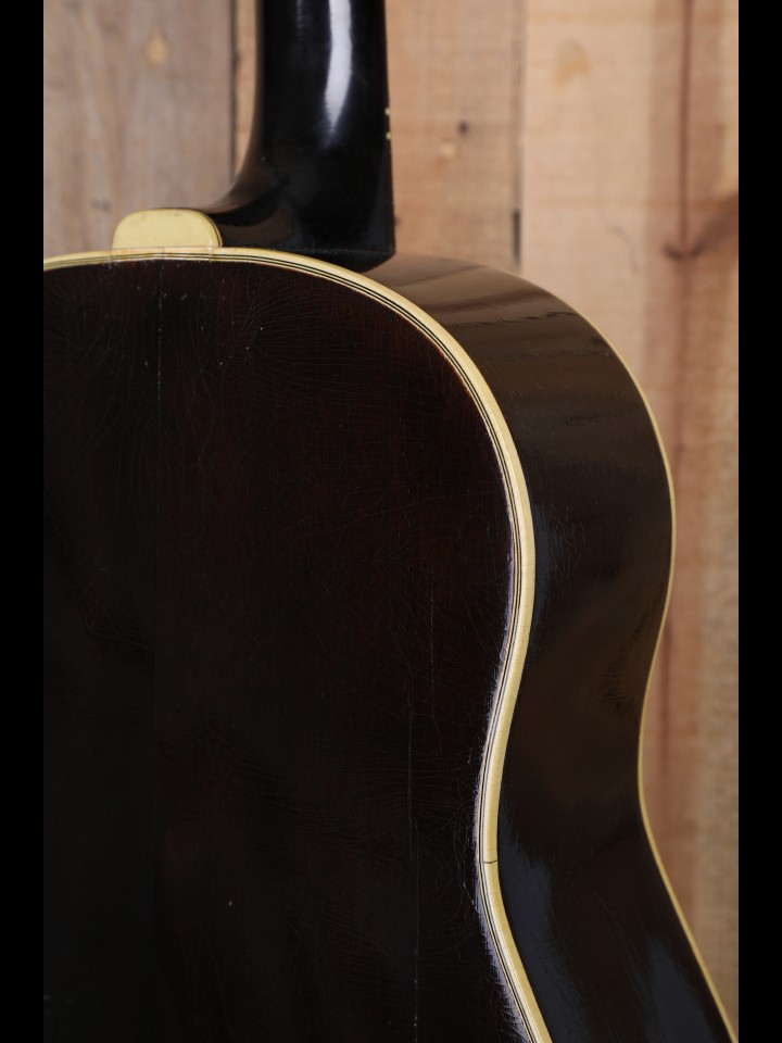As stated above, this SJ had numerous cracks that have since been addressed. Most obvious are those extending from the bridge to the butt on the top. Though it has been stabilized, one of these cracks was broad enough that it didn’t fully close, and thus remains open. Though properly shaped as a bottom belly style, the bridge is a slightly oversized Brazilian rosewood replacement (the original bridge was unsalvageable). The neck has been reset, and the frets have been replaced. The guitar also has evidence of complete overspray. GOOD+ Condition