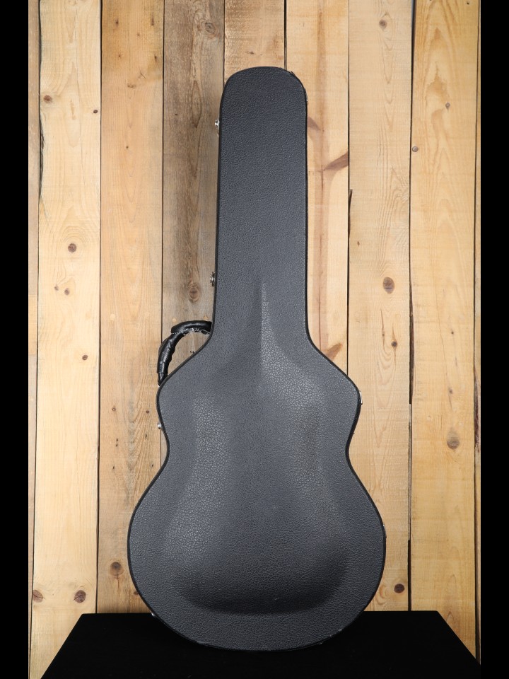 The majority of the top wear is concentrated on bass side, where we note a few shallow dents. The largest of these is situated towards the lower bout and measures approximately 5mm in diameter, while the two smaller dents are located closer to the waist and measure about 2mm in diameter. One can also detect a faint scratch running diagonally in front of bass side bridge foot, and also some faint impressions on the top along edge of lower bout. On the back of the guitar, we note a quite a number of deeper pinhead-sized dings, as well as a few longer and deeper dents/scars—this wear is seemingly concentrated in the center of the back, running from the upper waist towards the heelcap. Fortunately, none of this back wear is through the finish and it is not immediately obvious until captured in the right light, but it is a little more apparent than any wear elsewhere on the guitar. Finally, in addition to the repaired crack in the headstock veneer mentioned above, there are some other light finish scratches and swirls on headstock veneer. Otherwise, this guitar has no playability or structural issues to report; however, it should be noted that a K&K Pure Mini passive pickup (with volume control) and a gold strap button have been added. VERY GOOD condition.