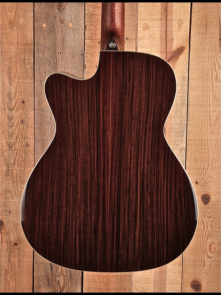 Tonally we have balanced the compression available from the smaller body size with a lighter weight X-brace design. This keeps the OM’s round notes and super-fast response but balances those features with a more open projection. No matter what music or playing style you gravitate to, this all-solid, finely dressed guitar is a true all-rounder with an impressive, eloquent voicing.