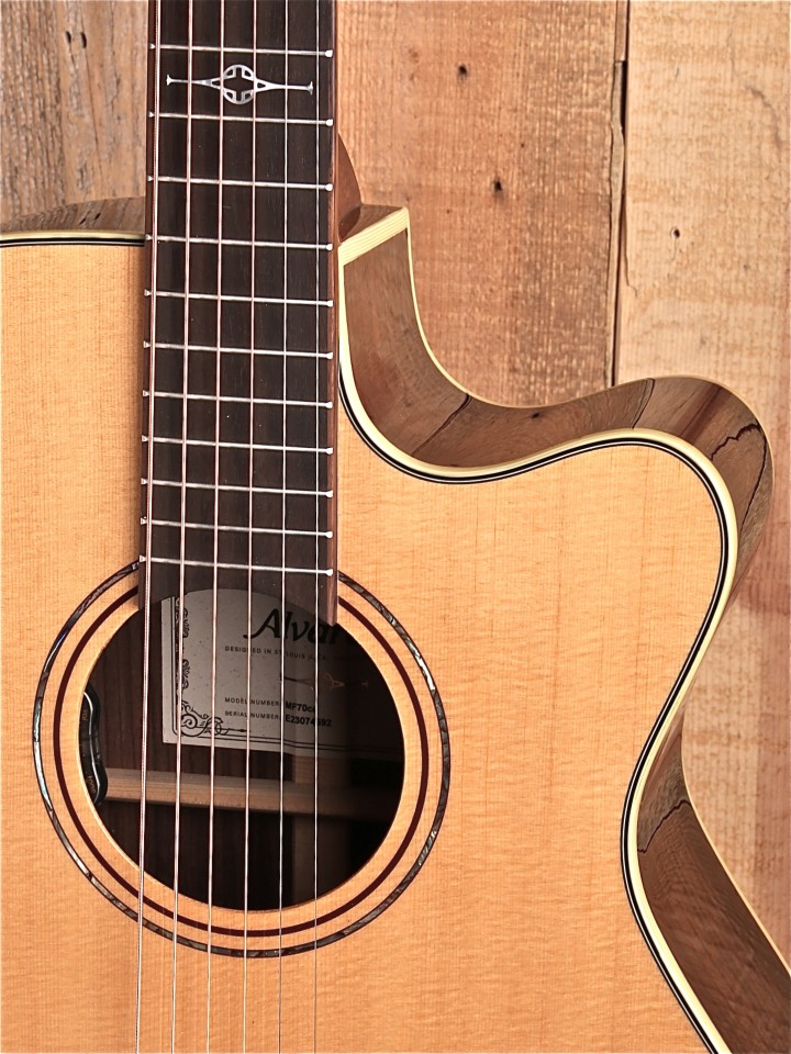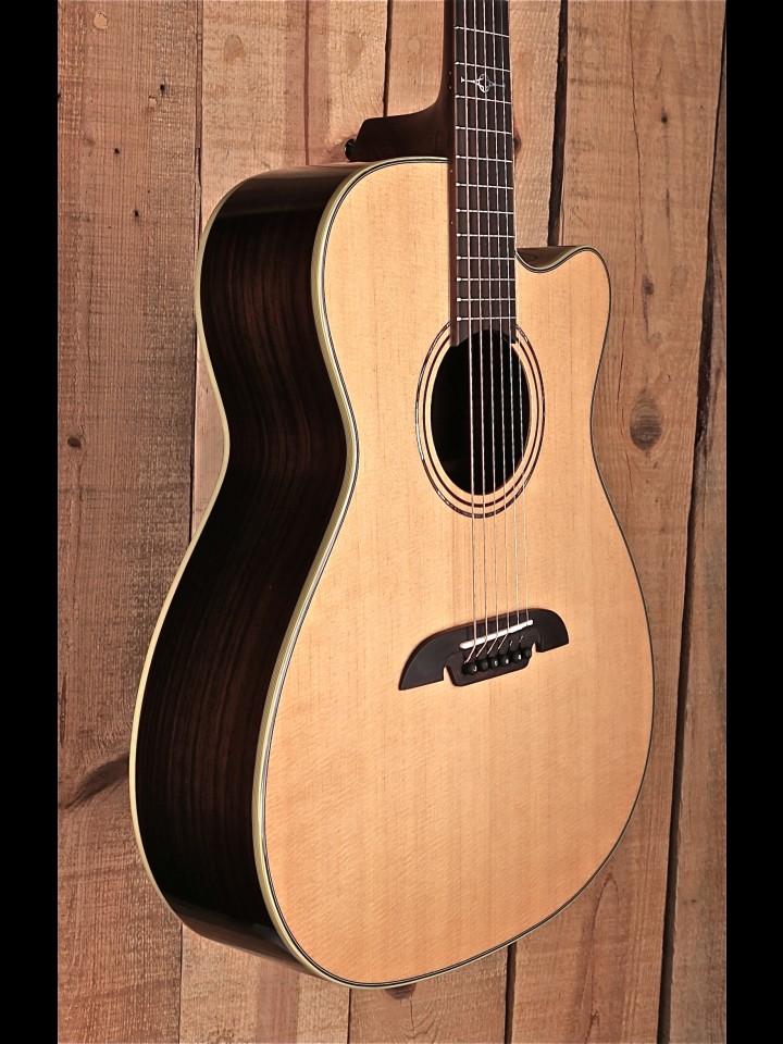 This cutaway model allows for easy access up the neck and is fitted with the LR Baggs HiFi system. HiFi pairs dual bridge plate sensors with high-fidelity electronics, providing exceptional balance, definition, dynamics, and good feedback resistance. The lightweight pickups preserve the integrity of your instrument’s bridge plate without negatively altering your acoustic tone. HiFi’s built-in, studio-quality preamp is voiced to complement the pickups for an optimal plug-and-play experience.” – From the Alvarez website