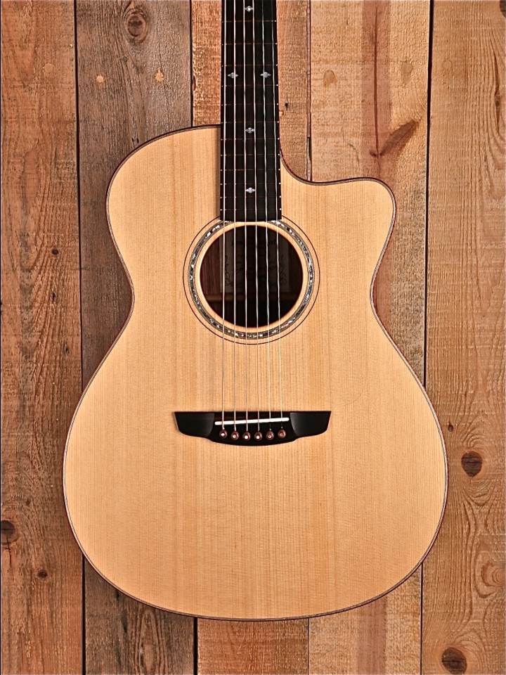 This Palo Escrito Grand Concert Cutaway is one we always look forward to receiving. Fashioned with a AAA Port Orford Cedar top, the sound sparkles and shines. Indeed, the PEGCC is another example of James’ work at its best, representing not only the evolution of the craft in terms of its construction, but a new standard of refinement in voicing, particularly where fingerstyle applications are concerned. As such, we have consistently observed that one simply cannot escape the thrall of this gorgeous model.
