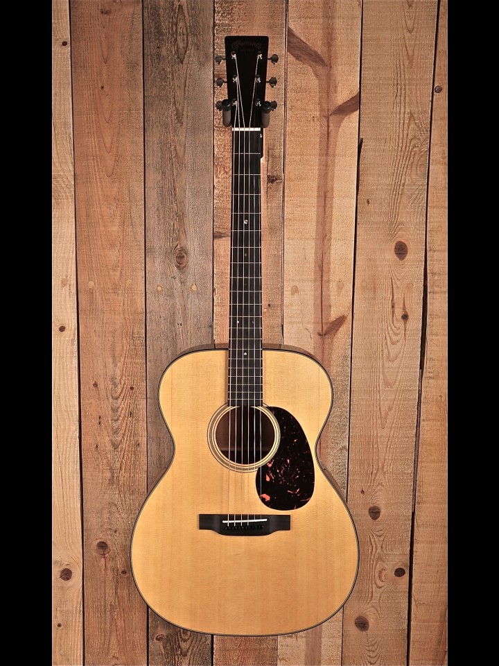 “Carrying a distinct vintage-inspired design and updated like the D-18 a few years ago, the redesigned 000-18 offers many of the features found in our pre-war era guitars. The 000-18, which has a beautiful aging toned top in Sitka spruce, is married with genuine mahogany back and sides. The body is edged with tortoise binding and complemented with a polished finish. The 24.9” short scale model’s neck features a modified low oval profile with Performing Artist taper, with a width of 1-3/4” at the nut and 2-5/32” string spacing for easy playability. Nickel open-geared tuners with butterbean knobs are found with a rosewood headplate, which displays a large old style Martin logo.” –From the Martin website