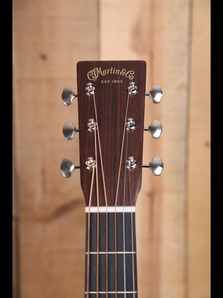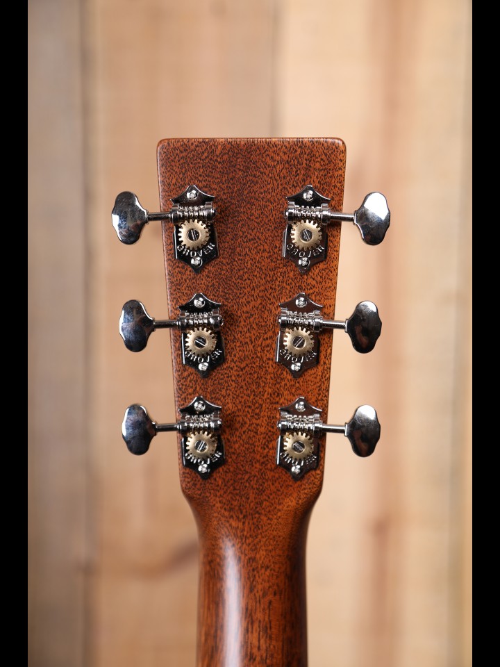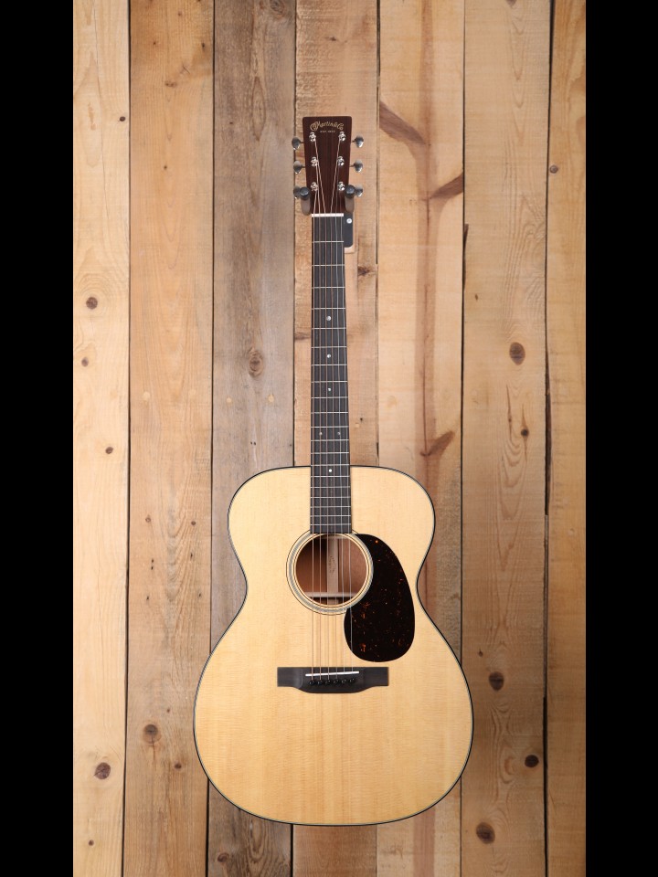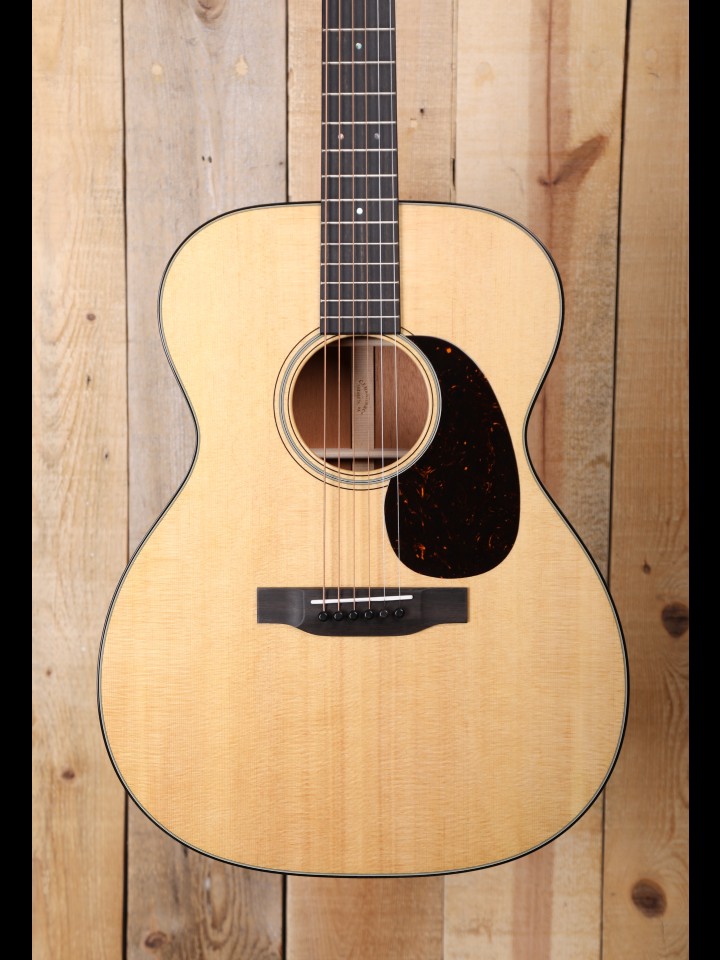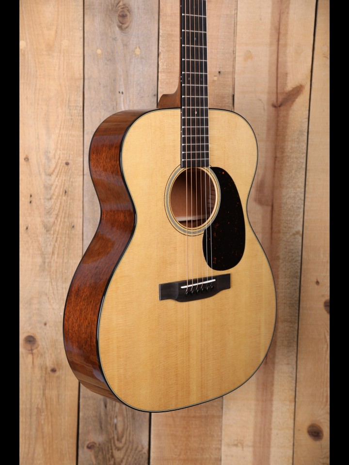 “Carrying a distinct vintage-inspired design and updated like the D-18 a few years ago, the redesigned 000-18 offers many of the features found in our pre-war era guitars. The 000-18, which has a beautiful aging toned top in Sitka spruce, is married with genuine mahogany back and sides. The body is edged with tortoise binding and complemented with a polished finish. The 24.9” short scale model’s neck features a modified low oval profile with Performing Artist taper, with a width of 1-3/4” at the nut and 2-5/32” string spacing for easy playability. Nickel open-geared tuners with butterbean knobs are found with a rosewood headplate, which displays a large old style Martin logo.” – From the Martin website