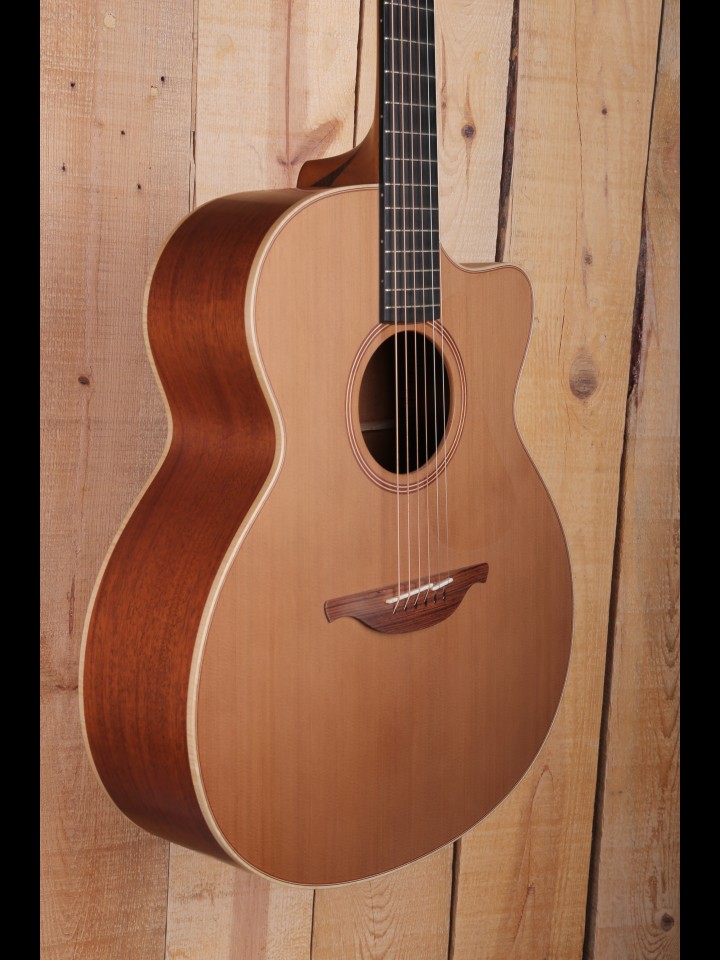 The O body size is arguably the signature Lowden design, and it exemplifies the clarity, depth, and dimension that is associated with Lowden guitars. In the case of the O-22 (formerly the O-10), the thin, responsive cedar top produces a warmth and complexity that is well-mated with the more quick, lively, and reflective qualities of the mahogany back and sides. This somewhat unusual pairing of tonewoods yields a powerful instrument where notes seem to deftly leap out with life and sophistication rather than just explode from the guitar. For these reasons, and with the benefit of the access afforded by its optional cutaway, the O-22C is an absolutely inspiring guitar to play, and thus remains one of our favorite and most popular Lowden models.