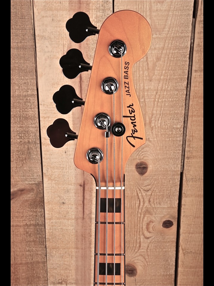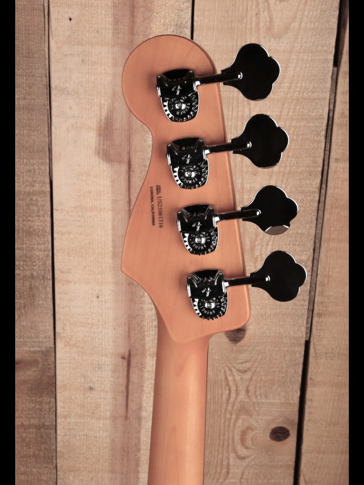 " American Ultra is our most advanced series of guitars and basses for discerning players who demand the ultimate in precision, performance and tone. The American Ultra Jazz Bass features a unique “Modern D” neck profile for hours of playing comfort, and the tapered neck heel allows easy access to the highest register. A speedy 10”-14” compound-radius fingerboard with 21 medium-jumbo frets means effortless action, while the Ultra Noiseless™ Vintage pickups and redesigned preamp provide endless tonal possibilities – without hum. The sculpted rear body contours are as beautiful as they are functional. This versatile, state-of-the-art instrument will inspire you to push your playing to new heights. Other features include “F”-stamped lightweight vintage-paddle tuning machines with tapered shafts, chrome hardware and bone nut. Includes premium molded hardshell case." - From the Fender website