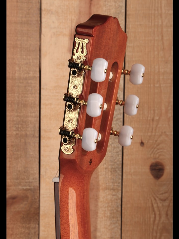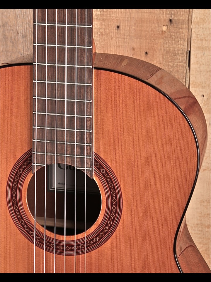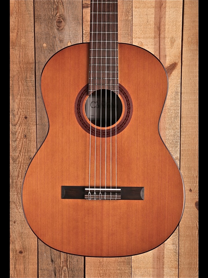 “One of Córdoba's flagship models, the C5 is perfect as a first nylon-string guitar, this lightweight model is built with a solid Cedar top and Mahogany back and sides to produce a clear, powerful tone with beautiful sustain. Handmade in the traditional Spanish style, the C5's carved headstock, hand-inlaid wood rosette, Pau Ferro binding, Savarez strings, and glossy PU finish result in a guitar that truly stands out from all other entry-level options. A lightweight adjustable truss rod is built into the neck for stability. Available in Natural finish with solid Engelmann Spruce top.” - From the Cordoba Website
