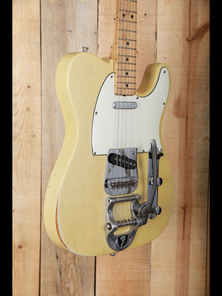1968 was a pivotal year for the Telecaster. Paul Bigsby had actually designed a version of his “True Vibrato” unit for Fender’s first “Solid Body Spanish Guitar” all the way back in 1953, but for some reason it didn’t catch on until 15 years later when for the first time the ’68 Fender catalog offered a Bigsby equipped Tele. Imagine being able to imitate the polyphonic, swooping vibrato of a steel guitar on a Telecaster! It added a whole new dimension to standard electric guitar playing. A factory Bigsby equipped Tele did not require the “through-the-body” steel ferrule-reinforced holes for stringing, as the entire bridge/vibrato tailpiece assembly was fully top-loaded. This meant the back of the body was plain (no holes), and this detail is the quickest way to tell whether the vibrato unit was installed by Fender or added later.