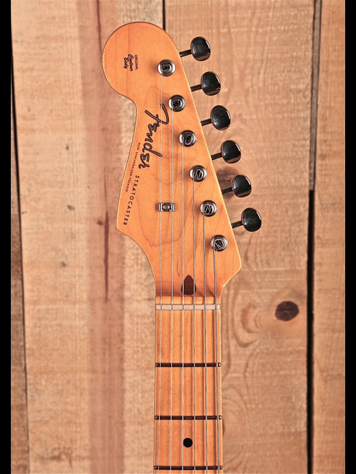 Featuring a trio of Pure Vintage '57 Stratocaster pickups, sweeping body contours and a supremely comfortable "V"-shape neck with a 7.25" radius maple fingerboard, the American Vintage II 1957 Stratocaster reproduces the quintessential tone and feel of the original. Other appointments include a vintage-accurate synchronized tremolo with cold rolled steel block and bent steel saddles, single-line "Fender Deluxe" tuners and a single-ply pickguard…” – From the Fender Website